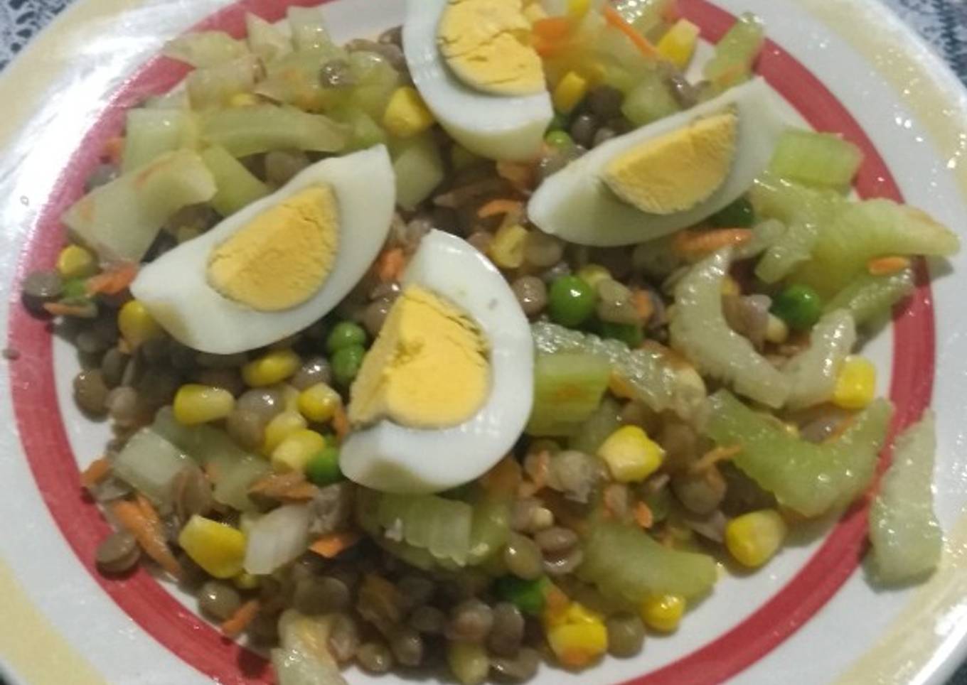 Hello everybody, I hope you are having an amazing day today. Today, I'm gonna show you how to prepare a special dish, Ensalada de lentejas. One of my favorites food recipes. This time, I am going to make it a little bit tasty. This is gonna smell and look delicious.