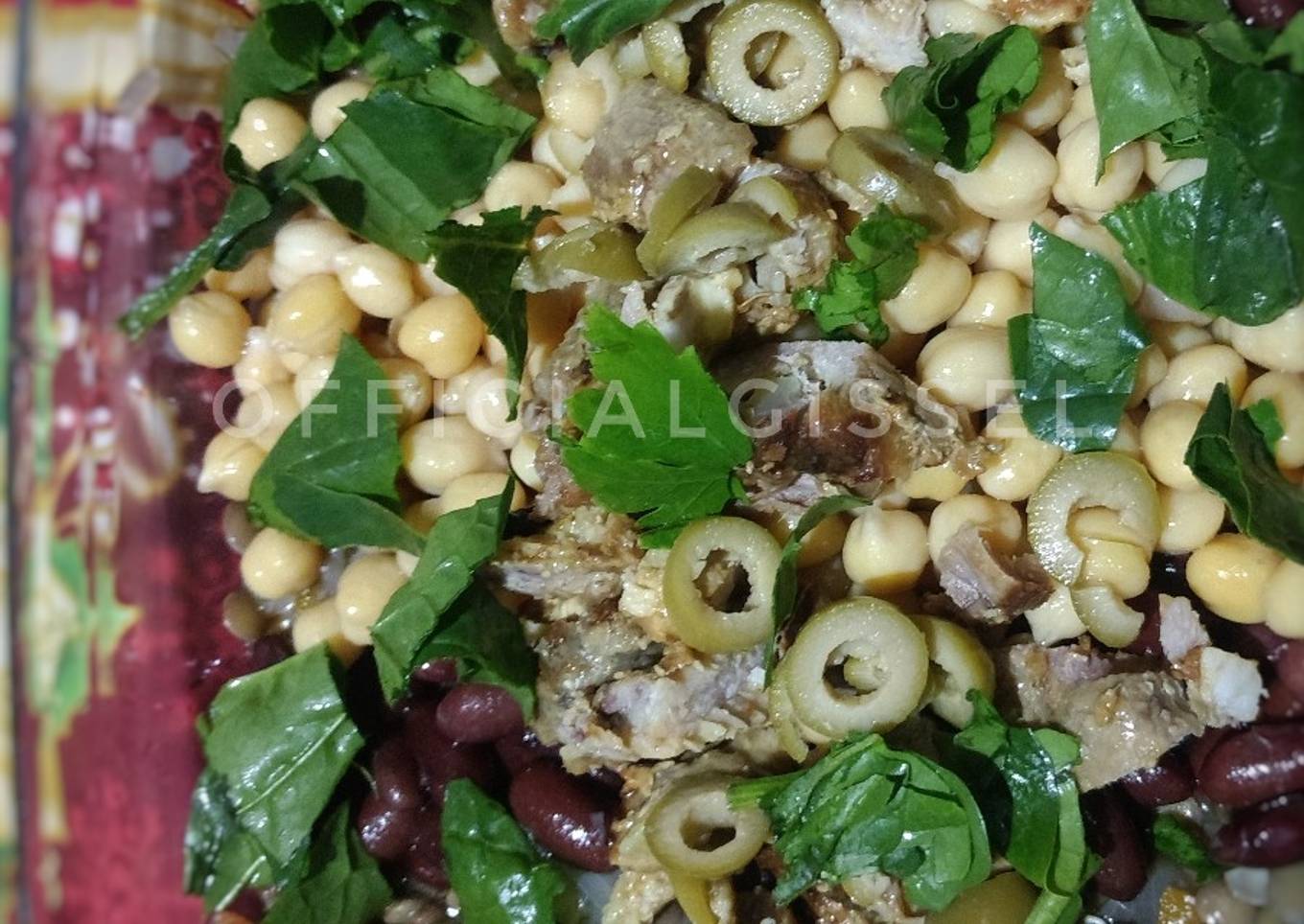 - En una fuente, poner la sopa de lentejas, (o 1 taza de lentejas cocidas) poner los porotos, garbanzos, el perejil picado por encima, hojas de espinaca y la carne en cubos pequeños o a gusto. Decorar con acitunas en rodajas.